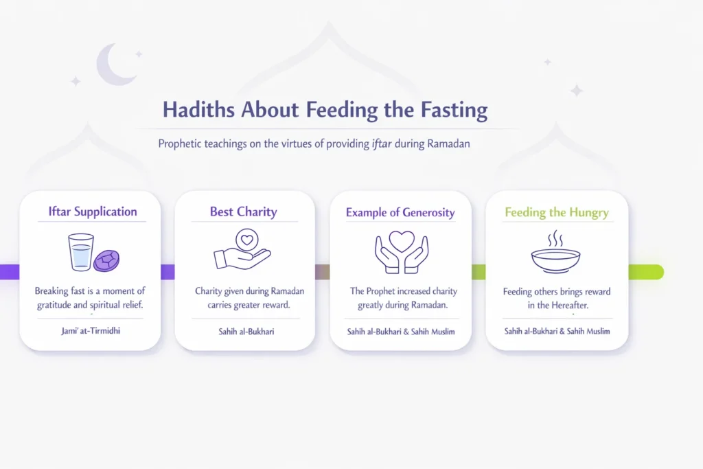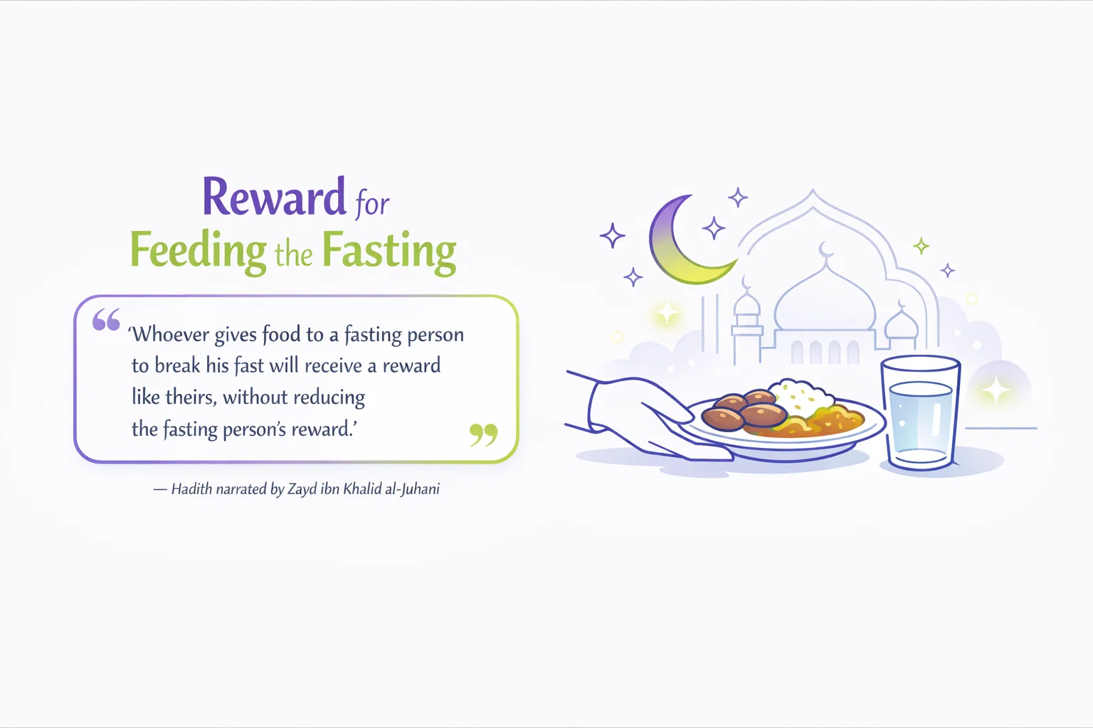 The most famous hadith about feeding the fasting is recorded by Imam Ahmad and Ibn Khuzaymah, narrated by Zayd ibn Khalid al-Juhani (may Allah be pleased with him). The Prophet Muhammad (peace be upon him) said: “Whoever gives food to a fasting person to break his fast, he will have a reward like his, without that detracting from his reward in the slightest.”
