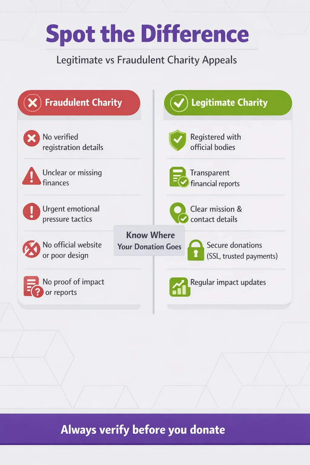 Avoid unverified social media appeals, newly created GoFundMe campaigns without charity backing, cold calls requesting donations, personal bank account details, and any organisation without Charity Commission registration.