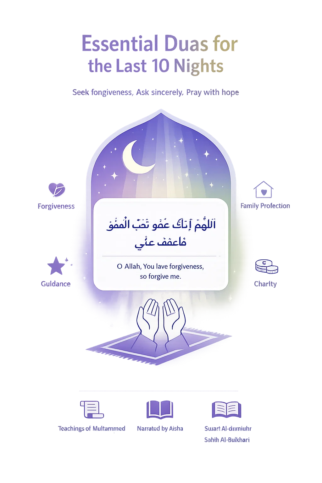 This simple yet powerful dua should be recited frequently throughout the last ten nights. It acknowledges Allah’s attribute of forgiveness and asks Him to extend that forgiveness to us. The beauty of this dua lies in its humility and directness.